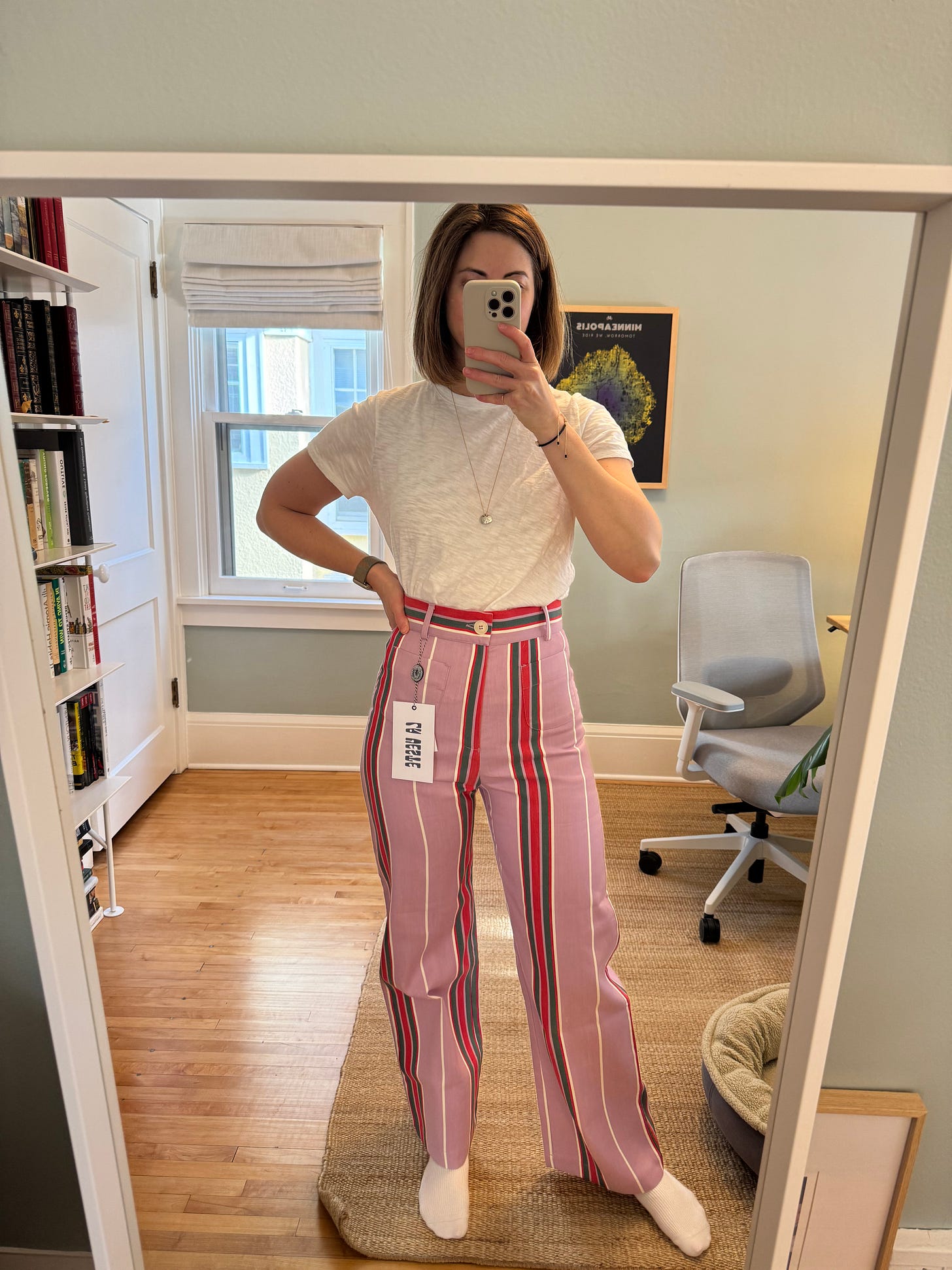 It's back to basics for me after an impulse buy turned nightmare (okay, I’m being dramatic- it was easy, but expensive) return. In my defense, I had thought about these pants and even featured them in a newsletter. It was the new colorway that got me thinking they were my dream pants. In my heart of hearts, I knew they wouldn’t work; they would be tight in the legs and loose in the waist, but I still needed to know. I ordered them (thank goodness for free shipping to me), and yes, the color is darling, but they fit exactly how I thought. So, for $40 they are going back to Spain, ya live, and ya learn right!